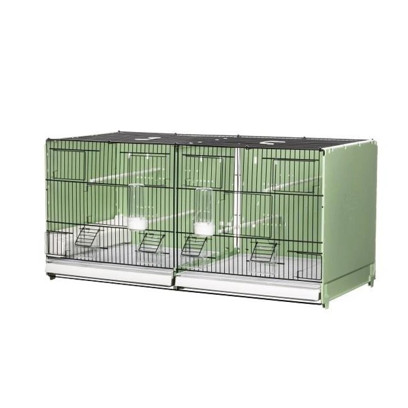 Jaula de cría de 90 cm 2GR para canarios, pájaros exóticos, periquitos, diamantes de gould, pájaros silvestres… Con un diseño cuidado y buena calidad, la jaula del fabricante italiano 2GR es perfecta para criar todo tipo de pájaros Características: •Totalmente plegable •Laterales y trasera de plástico •Sistema modular apilable •Con separador de plástico extraíble •Con palos, comederos y bebederos •Con dos bandejas extraíbles de plástico •Parrilla inferior •Con 4 puertas frontales de muelle en la parte superior y 2 puertas de muelle para inspección en la parte inferior Contenido: o2 bandejas inferiores o4 palos de apoyo o1 comedero rastrillo interior o4 comederos con apoyo exterior o2 bebederos o2 cajones para la recogida de excrementos o2 rejillas de separación horizontales para el cajón de excrementos o1 Rejilla para dividir la jaula en dos. Las jaulas se pueden unir para formar una sola voladera de 180 cm con el kit de transformación de voladera. La jaula de Cría es plegable, ocupa muy poco espacio y se puede desmontar y guardar fácilmente al final de la temporada. También permite un envío más seguro. Dimensiones: 90X40X40 Color: Verde/Blanca